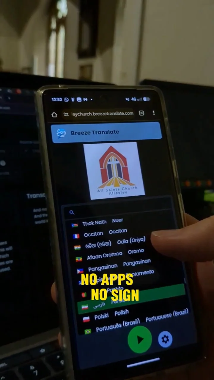 No extra equipment needed. No complicated setup. Starting as simply as a phone on a lectern, and people scan a QR code to read or listen along in their own language.